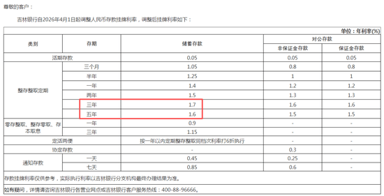 吉林银行则在4月1日当天公告,针对三年期整存整取定存挂牌利率进行调整,由年化1.75%降至1.70%,下调5个基点。
