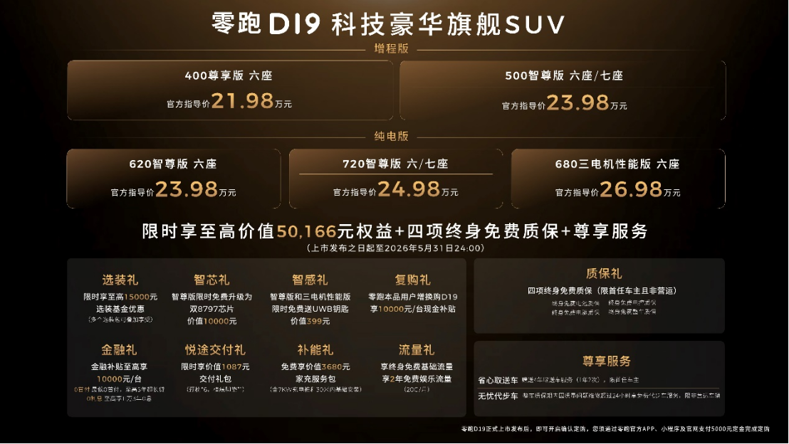 作为零跑十年技术沉淀的集大成之作,D19坚守全域自研初心,核心零部件自研自造占比超65%,依托零跑2025年销量登顶新势力、首次实现年度盈利的坚实基础,打造“顶配中的顶配”。新车提供纯电、增程双动力及六座、七座版本,限时下定可享价值最高50166元多重豪礼,兼顾多元化需求与高性价比。